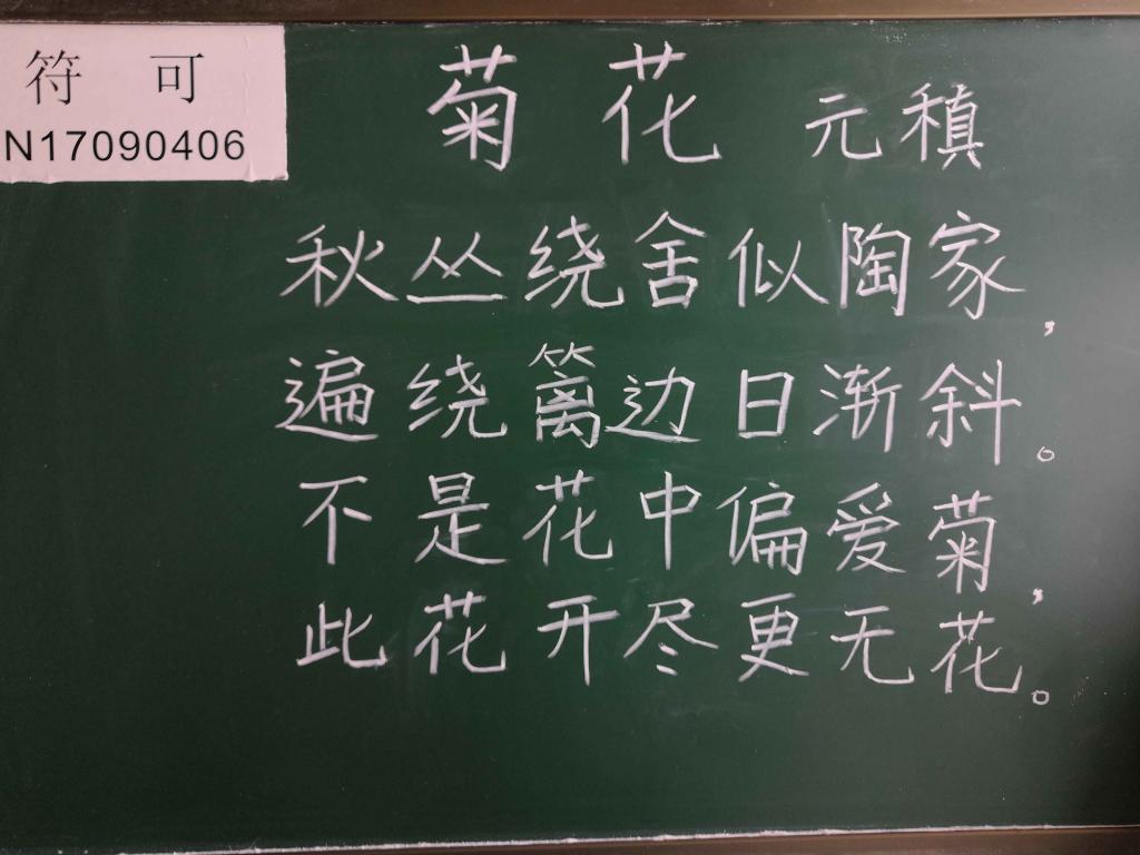 本次考核旨在“以考促练”,推动师范生自主开展粉笔字训练,从而提高学生粉笔字书写能力和板书设计能力。考核要求学生在规定的时间里,书写一首古诗。2017级师范学生在经过一年的勤学苦练后,粉笔字书写能力取得了长足的进步,面对这次考核他们信心满满。考核过程中,他们一个个下笔如有神,或端正大方、舒展有力,或形体美观、字体方正,或圆润、清秀……首首古诗在小黑板上跳跃而出,充分展现了beat365官网师范生扎实的基本功。2017级英语专业廖同学在考核后说,“自从学校要求开始练习粉笔字后,我的写字功底得到了极大的提升,随之而来的自信心也增强了不少,在面对将来的各类比赛、就业挑战更加有信心了。”