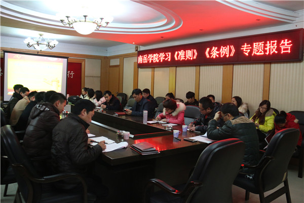 为深入学习和贯彻《中国共产党廉洁自律准则》与《中国共产党纪律处分条例》,进一步提高党员廉洁自律意识,12月29日下午,学院在行政楼308会议室组织召开学习《准则》、《条例》专题报告会。学院全体教工党员参加会议。