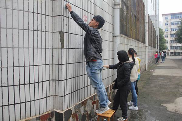 文科综合团总支党员先锋队在清理体育光墙上的“牛皮癣”