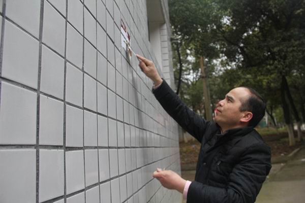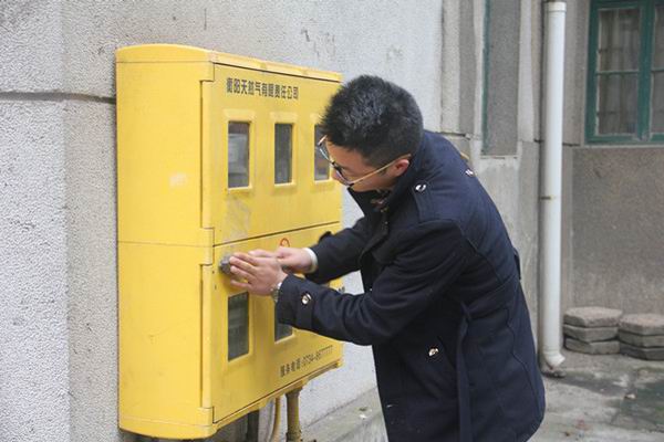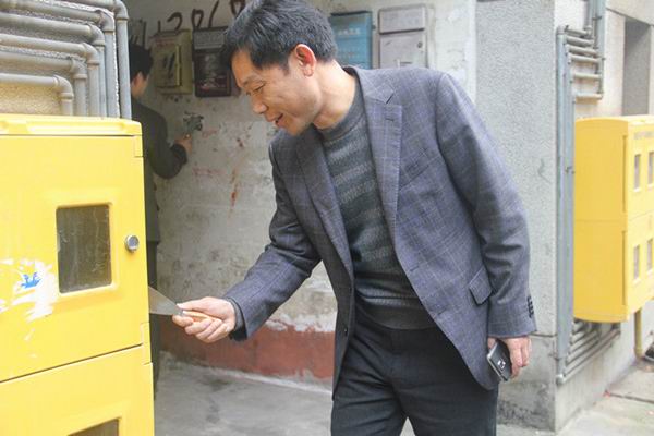 院长邓双喜在教师家属区清理天然气盒上的“牛皮癣”