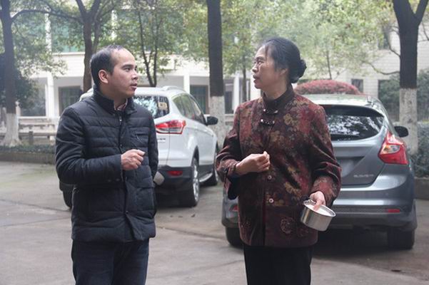 副院长梁文明在教师家属区向退休老教师宣讲清理“牛皮癣”工作