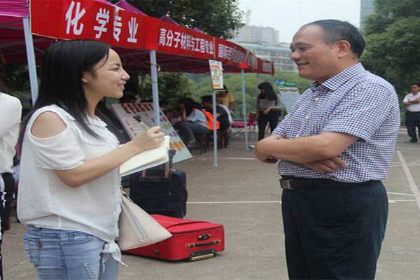 院长党总支书记高峰与新生家长交谈