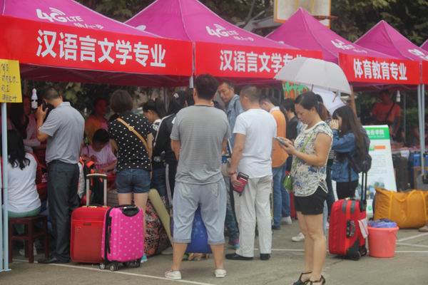 新生和家长在排队报到