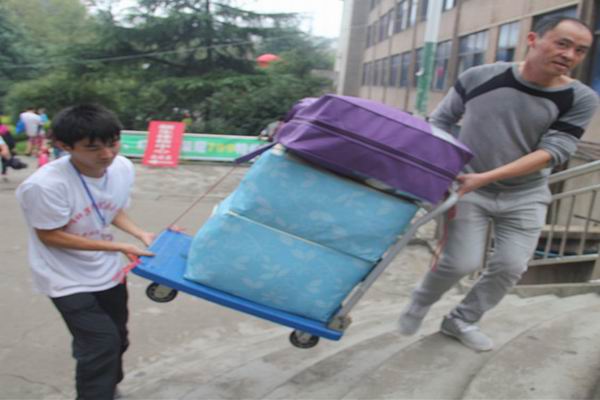 志愿者在为新生搬运行李