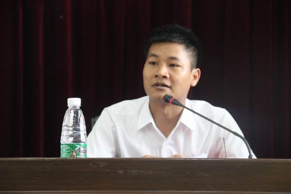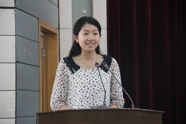 两位赴疆学子发言后,高书记和邓院长代表全院师生给他们分别赠送了一个保温杯,愿他们在缺水的南疆能时常感受到母校的温情。而后,中文系2011级汉语言文学专业陈颖洁同学作为在校学生代表发言,她真诚地祝福两位优秀的学长学姐,表示要学习他们的精神,珍惜大学时光,努力学习,坚定目标,服务基层,献身社会,实现生命价值。