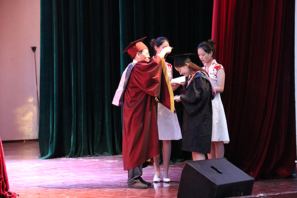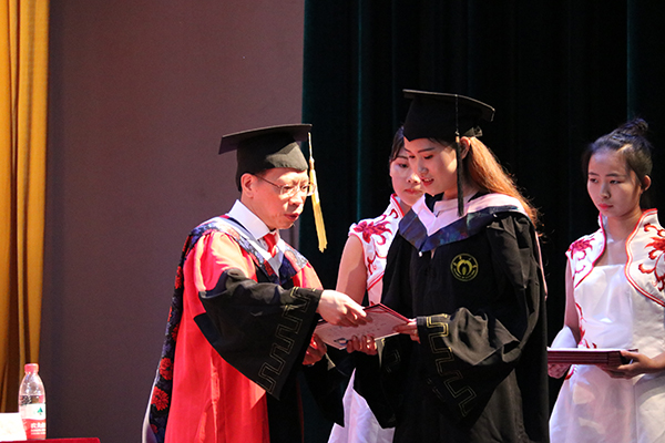 beat365官方网站副院长宋毅军宣读了《关于授予曹龙等949名2018届本科毕业生学士学位的决定》。毕业生代表身穿学士袍,款款走上主席台,院长王芳宇教授为毕业生代表颁发毕业证书。
