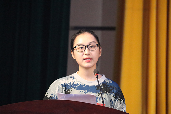 2019级汉语言文学专业朱雅澜同学作为新生代表发言,她代表新生做出承诺,在大学中明确学习目标,严格自律,不忘初心,奔跑追梦,不负学校和时代所托。