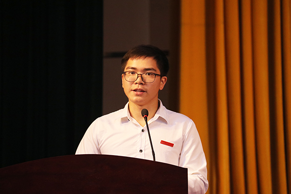 2017级英语专业焦吉洪同学作为在校生代表,在学习和生活上对学弟学妹们提出建议。学习上充分利用学院资源,生活上积极参加学院活动,将“厚德、博学、励志、笃行”的校训去传承发扬。