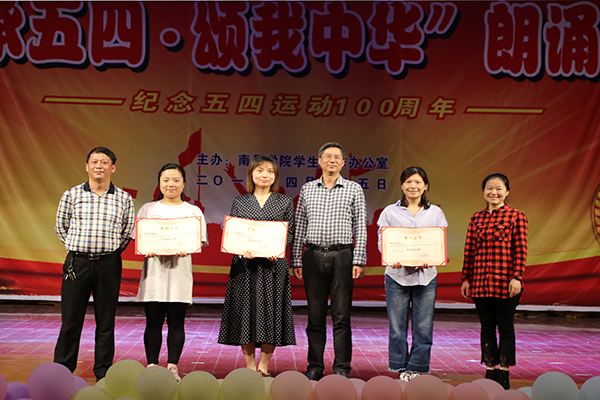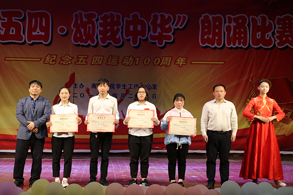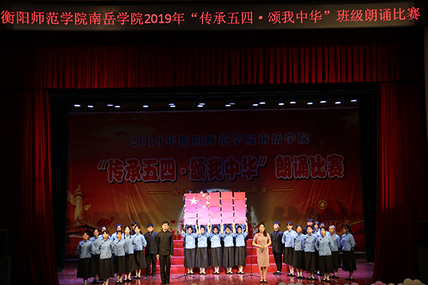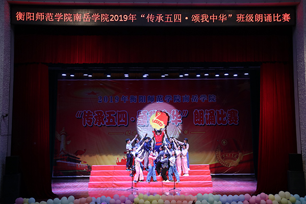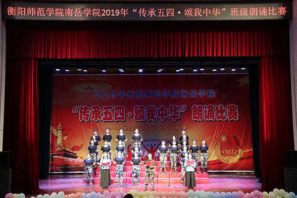 在场上,同学们服装靓丽、统一,朗诵词充满正能量,朗诵声音整齐、洪亮,富有情感,朗诵形式多样,有伴舞、伴唱、动作设计、道具造型等,抒发了南岳学子对五四精神的矢志学习,对党和祖国的真挚热爱,对中华民族伟大复兴中国梦的向往追求,展现了南岳学子朝气蓬勃,昂扬向上的精神风貌貌。整个比赛精彩纷呈,高潮迭起。经过激烈比拼,2017级汉语言文学三班荣获一等奖;2017级英语一班、2018级美术二班荣获二等奖;2017级汉语言文学一班、2017级数学三班、2018级数学三班荣获三等奖;2017级地理科学二班、2017级体育四班、2018级英语六班以及2017级法学一班荣获优胜奖。文科综合管理办、理科综合管理办和外语管理办荣获优秀组织单位奖。在热烈的掌声中,本次比赛圆满结束。