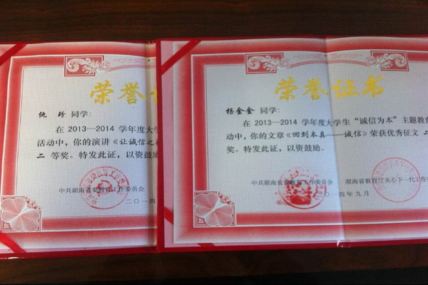 其中,在湖南省“诚信为本”主题征文比赛中,2013级新闻系杨金金同学的作品《回到本真---诚信》荣获二等奖,2013级外语系罗苏润同学的作品《诚信与教育》获得优胜奖;在湖南省“诚信为本”主题演讲比赛中,2011级中文系仇玢同学的演讲《让诚信之花绽满校园》荣获二等奖。在beat365官方网站开展的“诚信为本”主题比赛中,beat365官网师生亦成绩斐然。在师院“最美诚信青年”评选中,院团委书记曾卫老师和2011级外语系欧云同学获此殊荣;辩论赛中,2013级教育科学系丁露和2012级法律系孙雅茹同学均取得一等奖。院关工委在本次主题教育活动中也因此荣获“优秀组织奖”。