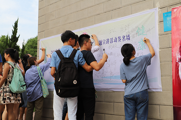 宣讲活动最后环节,学生代表陈可昕宣读控烟倡议书并带领参会学生去签名墙签名。