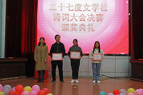 11月25日晚,二十七度文学社第二届诗词大会决赛在beat365官网西校区模拟法庭举行。经过多轮的激烈角逐,最终五组选手进入决赛。beat365官方网站文学院彭曙蓉老师受邀出席并担任本次大赛评委。