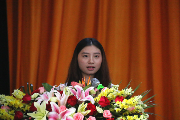2014级外语系邵雨柔同学代表老生发言。她结合自身两年的生活经历,给新生的大学生活提出了宝贵建议,鼓励新生积极参与校园活动和社会实践活动,在努力学习的同时培养自身各方面的能力,完成从中学时代到大学生活的完美蜕变。