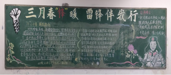 各班黑板报构思灵巧,黑板报文字内容有创新。将雷锋精神内化于心、外化于行,用雷锋精神激励全体学生爱党爱民。不但在黑板报作品的创作中提高了学生对雷锋故事的知晓度,而且营造了学习雷锋的浓厚氛围。让学雷锋在社会中特别是青年学生中蔚然成风,让学雷锋活动融入日常、化作经常。经过严格评审,最终2022级学前教育二班荣获一等奖,2022级汉语言文学二班、2022级汉语言文学五班荣获二等奖,2022级汉语言文学一班、2022级法学一班、2022级思想政治教育一班荣获三等奖。