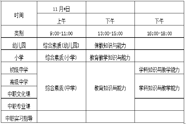 我省教师资格考试笔试每年组织一次,安排在11月举行(当年的具体考试时间由省教育考试院另行公告)。考试类别和科目安排如下: